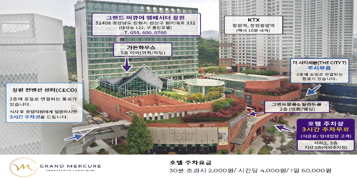 *주차는 호텔 B2,B3F & 지상 5F 주차 가능하며 요금은 식음료, 임대업장 고객은 3시간 무료 이용이 가능하며,