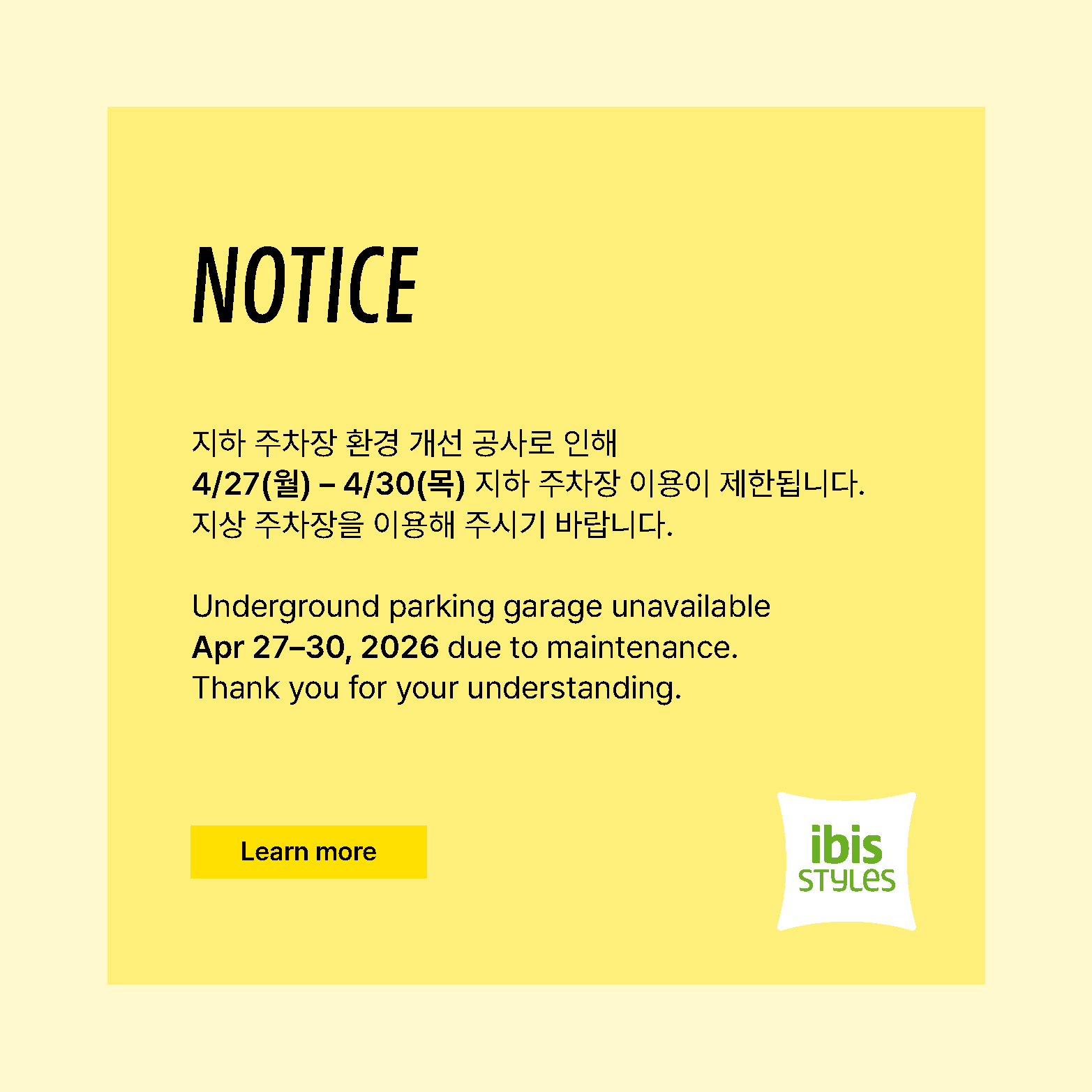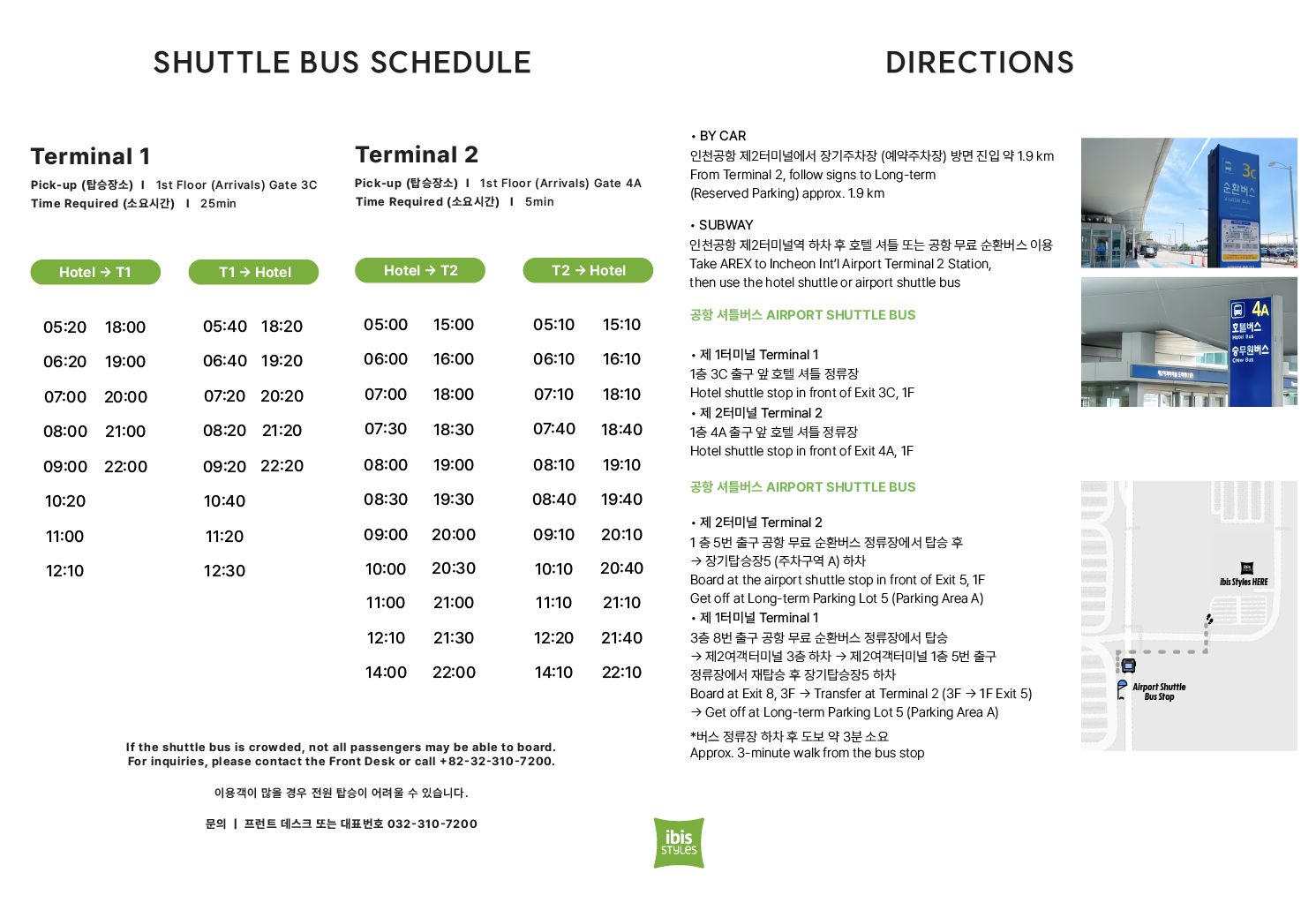 | 호텔 셔틀버스 (공항→호텔) | ㆍ 제 2 여객터미널 1층 (도착장) 4A 정류장 / 소요시간 : 5~10분 ㆍ 시간표 : 하단 [셔틀버스 시간표] 메뉴 참고 |