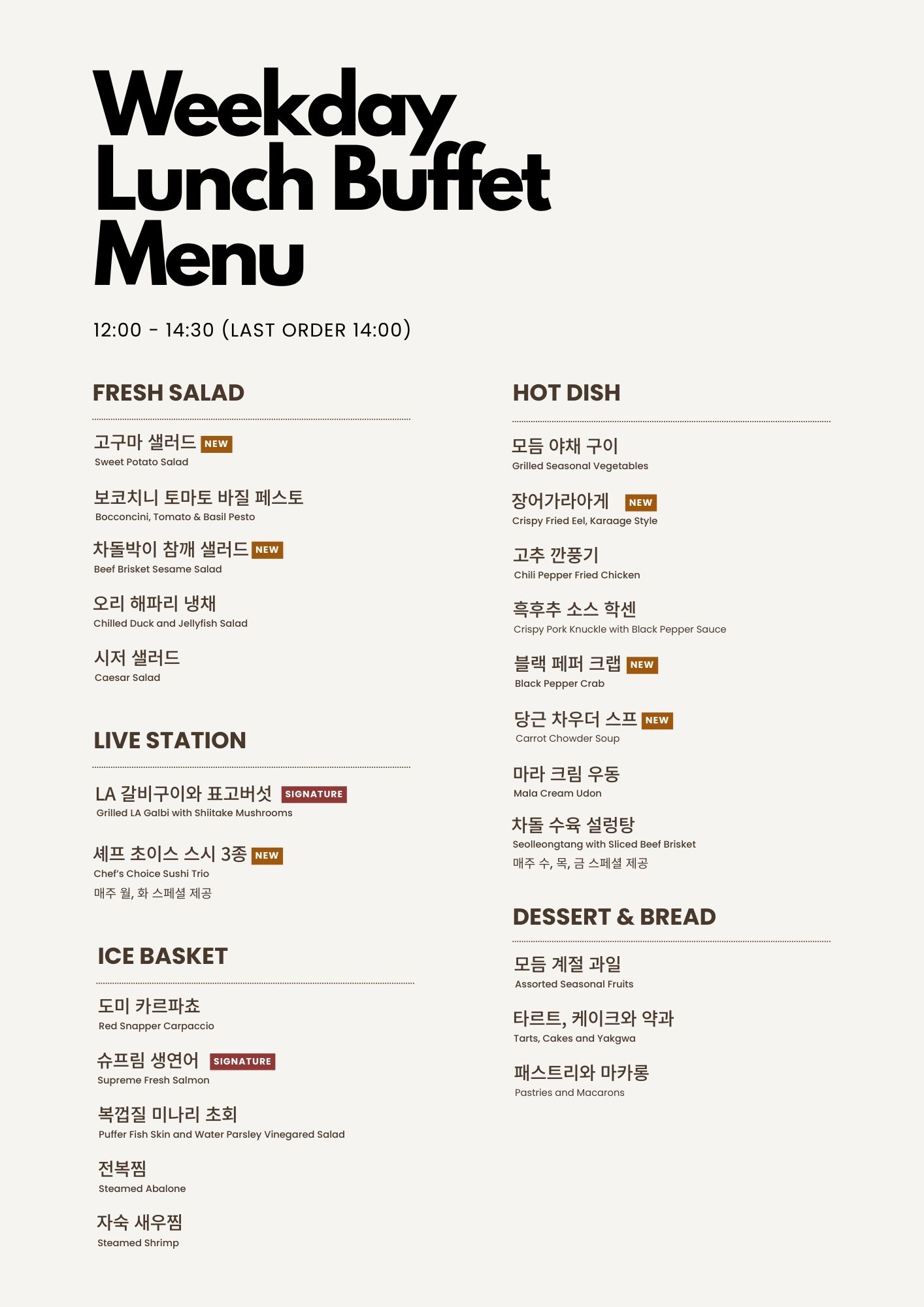週末ブランチビュッフェ:大人 19,800ウォン / 子供 12,000ウォン