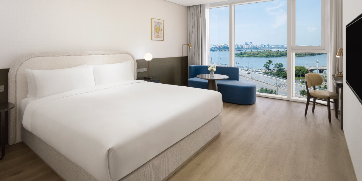 The Deluxe River room embodies the heart of the hotel’s essence. Overlooking the Han River and Seoul’s dynamic yet serene scenes through the ceiling-to-floor windows helps to find a moment to be recharged. Feature a king-sized bed, marble bathroom with round-type bathtub, separate rainfall shower, and a 55’’ 4K UHD Smart TV.