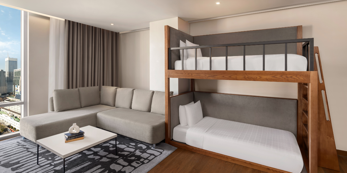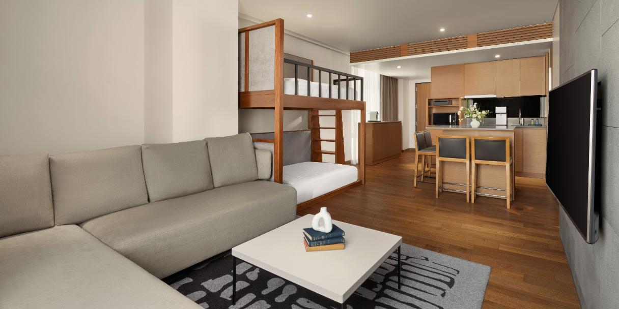 Premier Family 1 Bedroom is a premium residence-type room designed for families and group stays, featuring a bunk bed added to the existing Premier 1 Bedroom layout. Equipped with a kitchenette, washing machine, and a dedicated workspace, it is ideal for both short- and long-term stays. Its efficient layout ensures a comfortable and spacious environment, even for multiple guests. Guests can also enjoy access to the fitness center and indoor and outdoor rooftop swimming pools, completing a well-balanced and relaxing stay in the heart of the city.