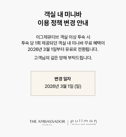플래티넘급 이상 제휴 신용 카드 소지 시 주차대행서비스를 무료로 제공합니다. * 자세한 사항은 도어 데스크로 문의하여 주십시오. |